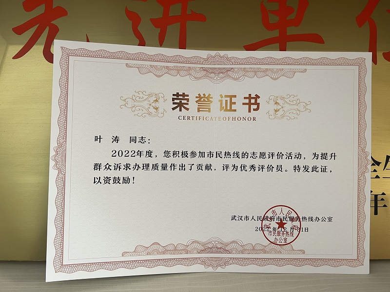 近日,我公司員工葉濤同志獲武漢市人民政府市民熱線辦公室頒發(fā)的年度優(yōu)秀評價員榮譽證書。