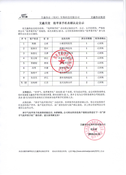 艾鑫天使傳媒報道 11月10日,艾鑫偉業集團推出“拼手氣 搶蘋果7手機”活動,引來全國各大寵物醫院院長的熱捧,不到一天時間,第一輪活動10個名額已經全部訂滿。