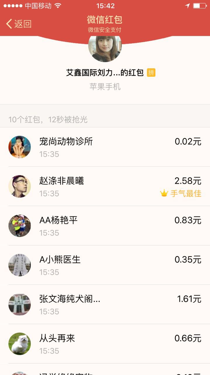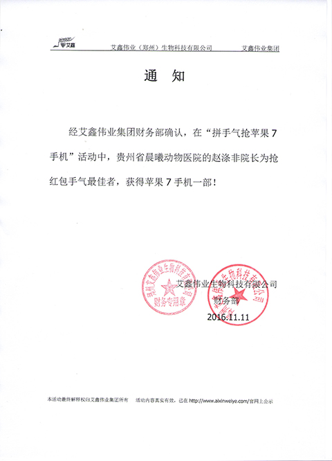 今天,我們正式揭曉“拼手氣 搶蘋果7手機”活動的獲獎名單,本輪活動“最佳手氣獎”——蘋果7手機由貴州省晨曦動物醫院趙滌非院長摘得。在這里,要恭喜晨曦動物醫院趙滌非院長成為我們第一輪活動搶紅包的“最佳手氣王”。也祝賀其他幾位院長獲得鼓勵獎——艾鑫偉業集團公司提供的300元產品大禮包一份!