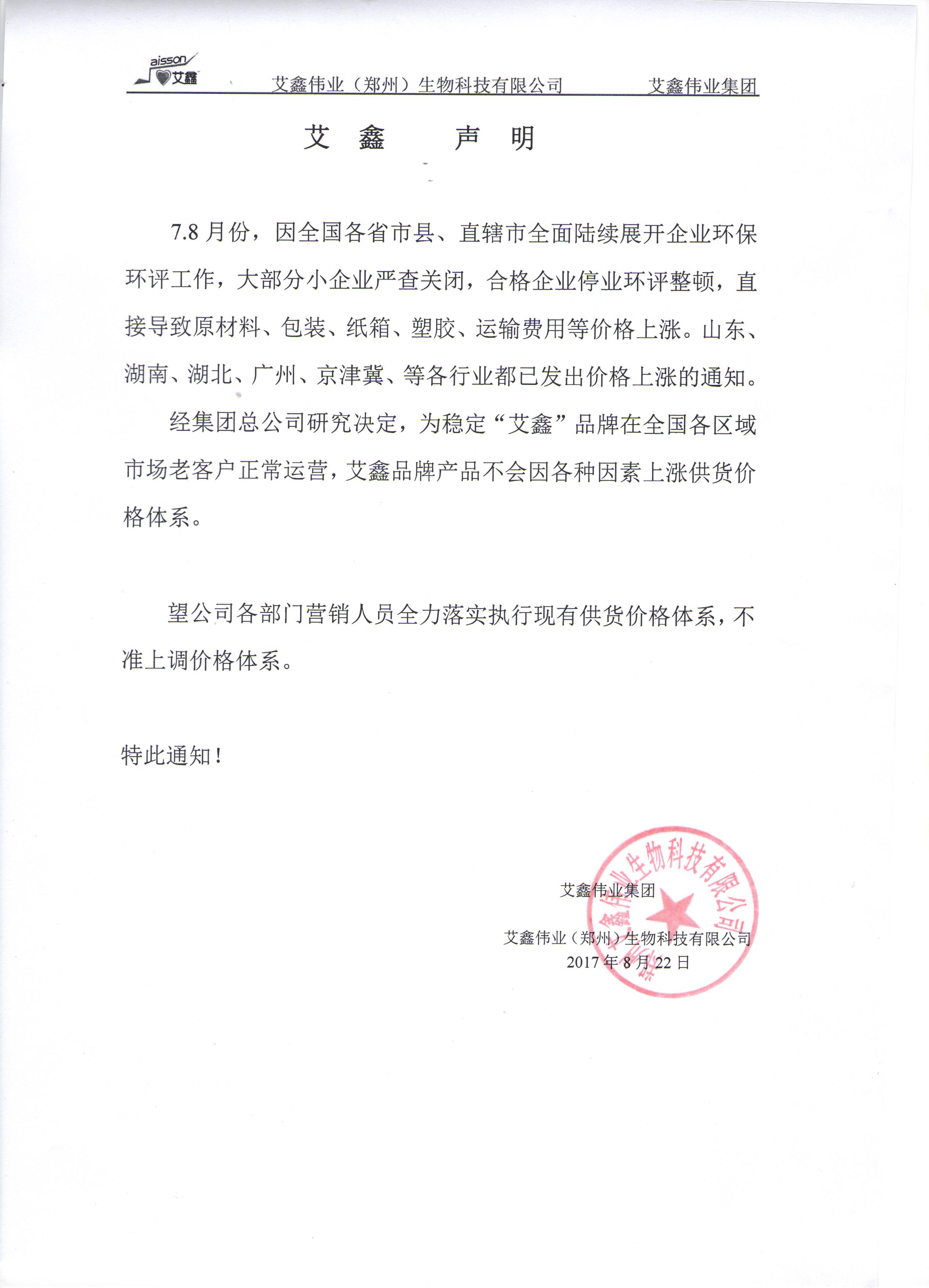 艾鑫偉業集團有關不上漲價格體系的通知