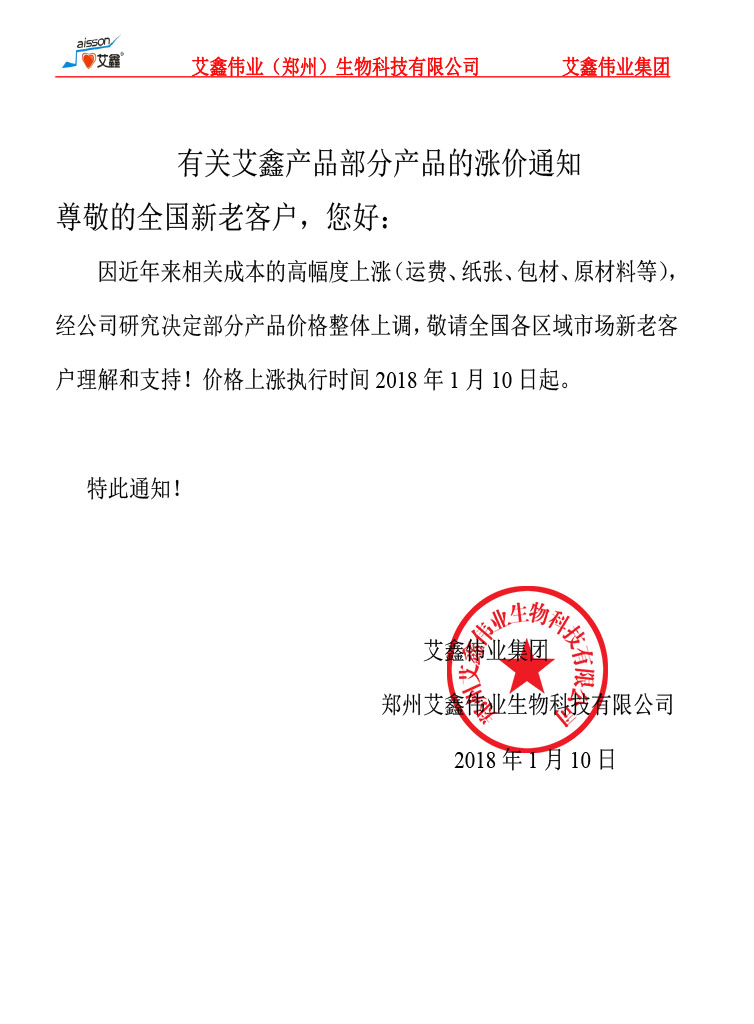 2018年,艾鑫品牌價格上調的通知