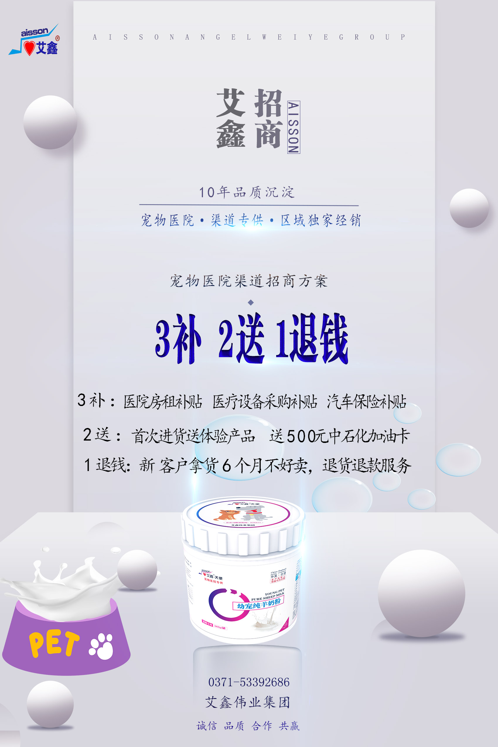 艾鑫天使系列產品10年來公司始終堅持全國區(qū)域市場獨家寵物醫(yī)院專供,禁止網上渠道銷售,也得到了廣大新老客戶的一致認可和合作。為了更好將艾鑫偉業(yè)集團公司的戰(zhàn)略發(fā)展和全國市場布局更快實現,夯實全國寵物醫(yī)院授權經銷客戶的合作共贏關系,實現全國授權合作3500家寵物醫(yī)院的目標方針。公司決定2020年的招商方案全面開展,即“3補、2送、1退錢”,讓每一位新客戶放心合作,讓每一位老客戶實現共贏。