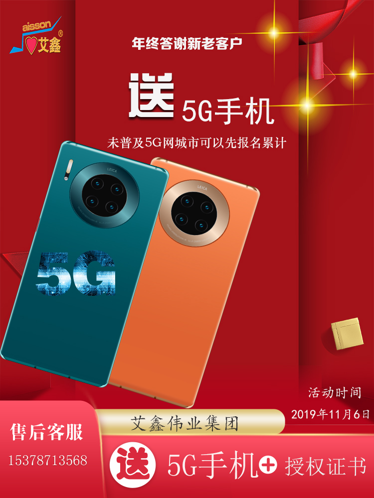 2019年11.6日起,艾鑫品牌年終答謝全國新老客戶開始了,贈送5G手機,有華為mate30 8G+128GB,8G+256GB,mate30pro8G+256GB,mate30pro8G+512GB,小米9pro12G+512GB,vivoIQOO12G+128GB,等多款5G品牌正品手機。